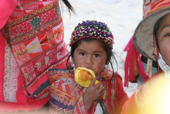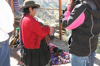 At every turnout where the bus stopped on the journey to Pisac and at the top of the mountain we’d descend to reach the market at Pisac, as if to warm us up, to whet our appetites for buying, to prepare us for the panoply of choices available there, full-skirted women wearing brown felt hats and red wool jackets, long black braids down their backs and dancing black-eyed children with adoring, pleading, coaxing voices sold us water and water bottle holders, beaded strings for our sunglasses, chullos and whistles and musical instruments. No end to the items they offered, no end to our need for novelty, no end to our need not to disappoint…
