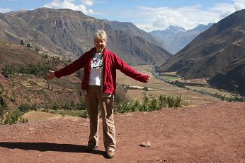 Cemetery holes in lacy, eroded hillsides, precursors of those we had seen in the hillside in Lima… delicate yellow wildflowers holding their own in dry, vast space…terraces and granaries where Incan farmers long ago worked out the exact altitude at which to grow each of the varieties of corn and potatoes…Incan walls, stones set to withstand earthquakes and the destruction of men…steep stone steps cut into the earth, staircases of them, one after the other, meant to ease the descent—or the climb—but not for us: legs the wrong length, bodies unused to the effort, the altitude, the sun. But exhilarating nonetheless, the walk to Pisac. Accomplishment. Activity. Away from crowds and buying and selling and tasting. Shared venture.