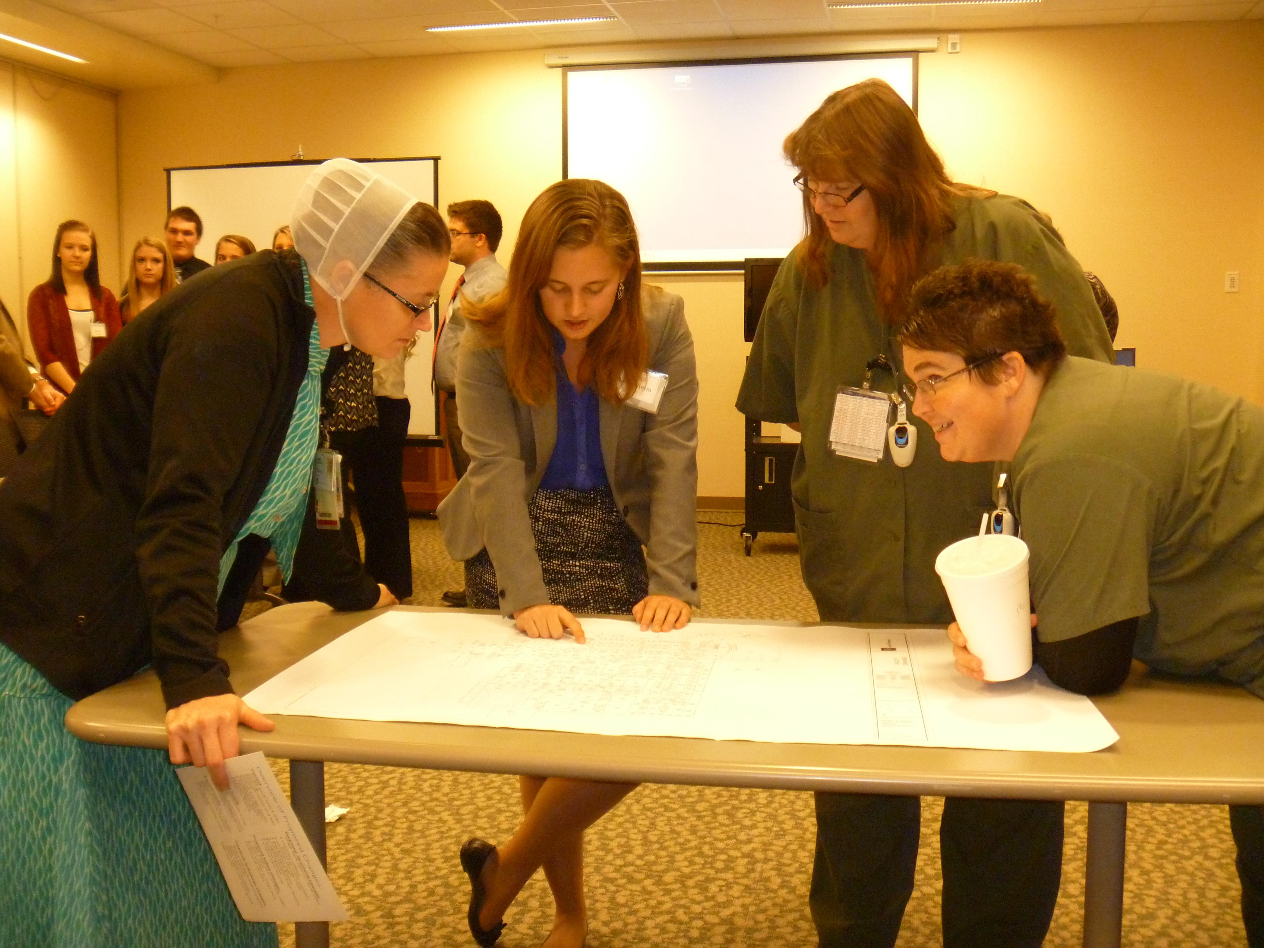 No presentation, it seems, goes without a technology hitch, and although the one these students experienced was crushing, they didn’t miss a beat or even make a face. One of the students, who had a background in civil engineering classes, had created a CAD drawing of the architectural redesign, but a software licensing glitch prevented her from showing it to the assembled hospital personnel. However, she also had produced a blueprint, and at the conclusion of the presentation, explained the changes her team had envisioned to a group crowded around a table. P1040754