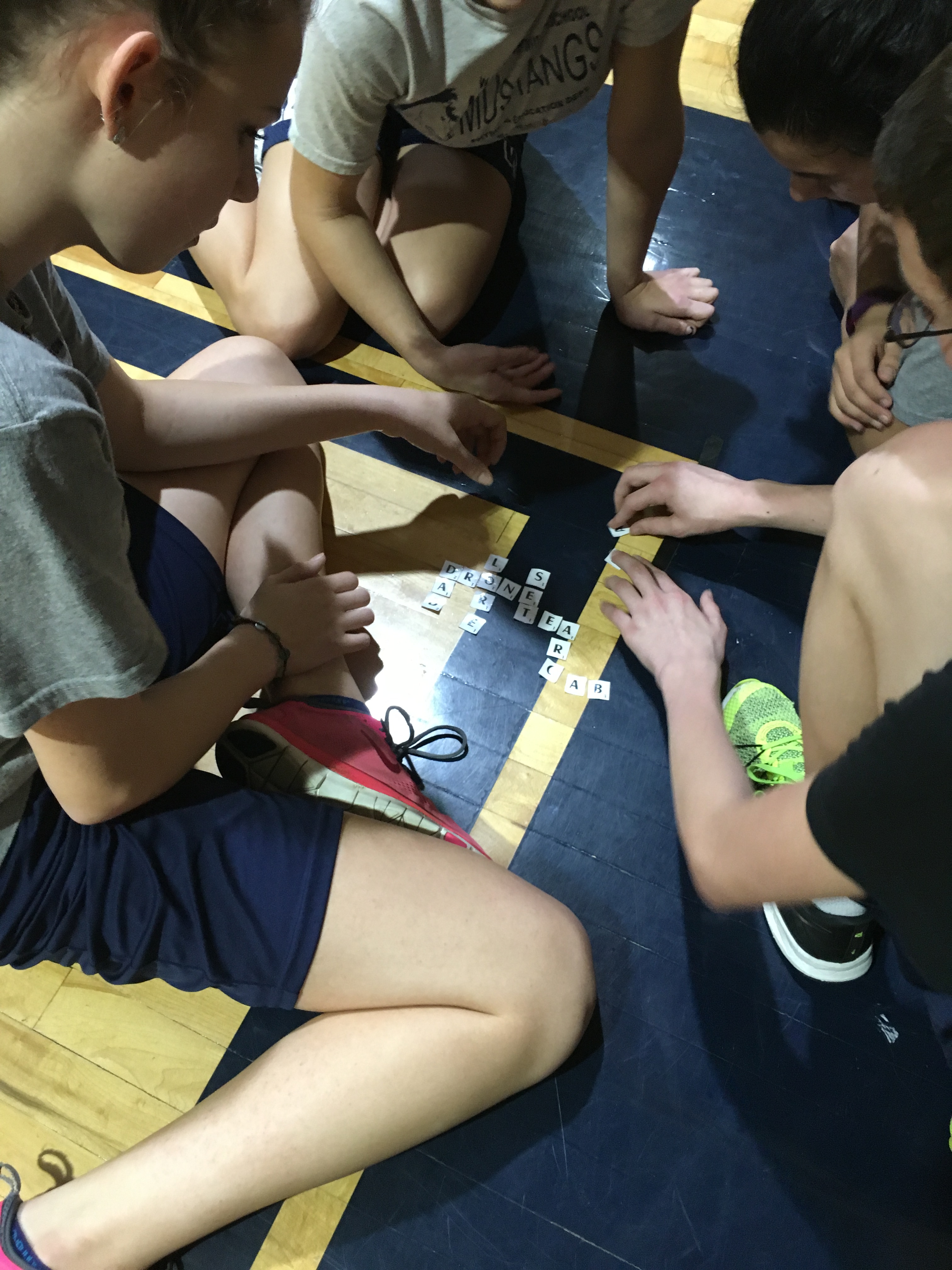 “You need twenty tiles, all underneath the cone in the center of the gym. When the music starts, skip to the center, do five curl-ups, and then take one tile. Skip back to your corner of the gym and put your tile in the cone at your place. You have to do this five times. When you each have gotten five tiles, work together to create a bananagram that uses all twenty tiles.”