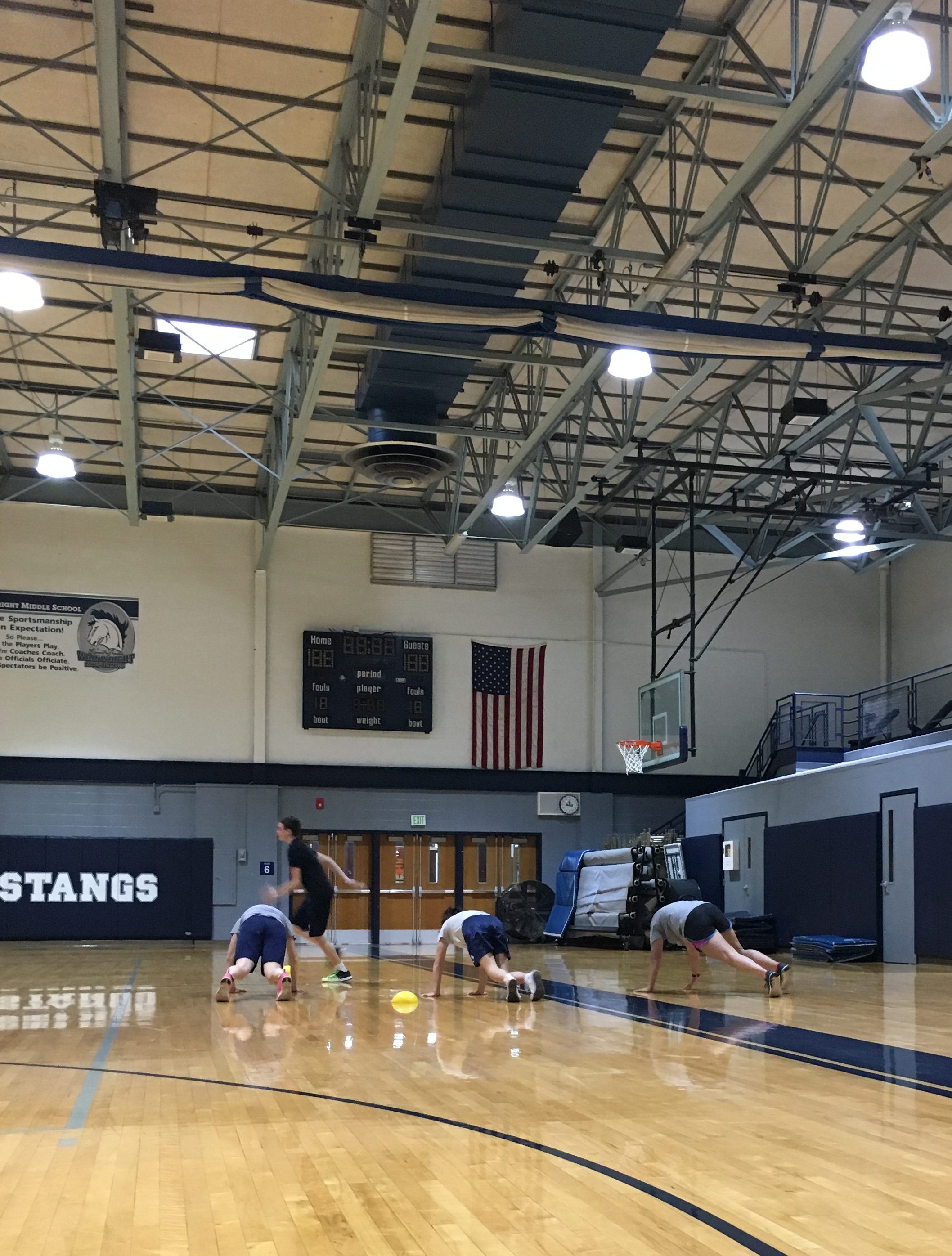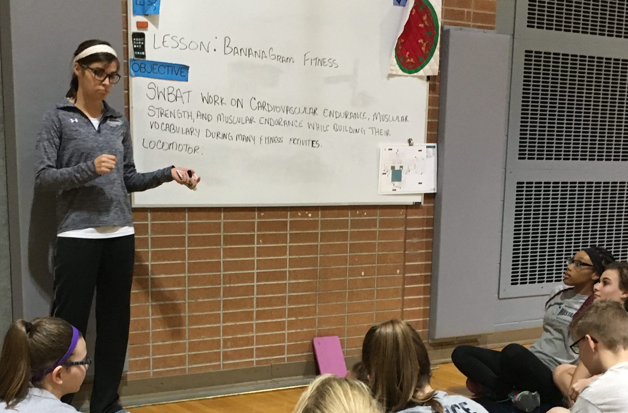And with that, the 8th grader in the blue and gray PE uniform of her middle school jumped up, skipped to the center of the gym, picked up three more tiles and returned, skipping, to her group. The four students quickly employed the new letter tiles to complete their entry in this round of Bananagram Fitness.