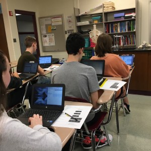 The e-textbook Mrs. Ploss uses for Honors Chemistry has many bells and whistles. The study tools section includes, among other things, premade flashcards for academic vocabulary, keyed to each chapter. Skill builders and problem sets, answers and explanations for those sets, pop-ups in the text for vocabulary, figures and diagrams and charts hyperlinked internally, built-in highlighters—all were among the features she pointed out or demonstrated for the students.